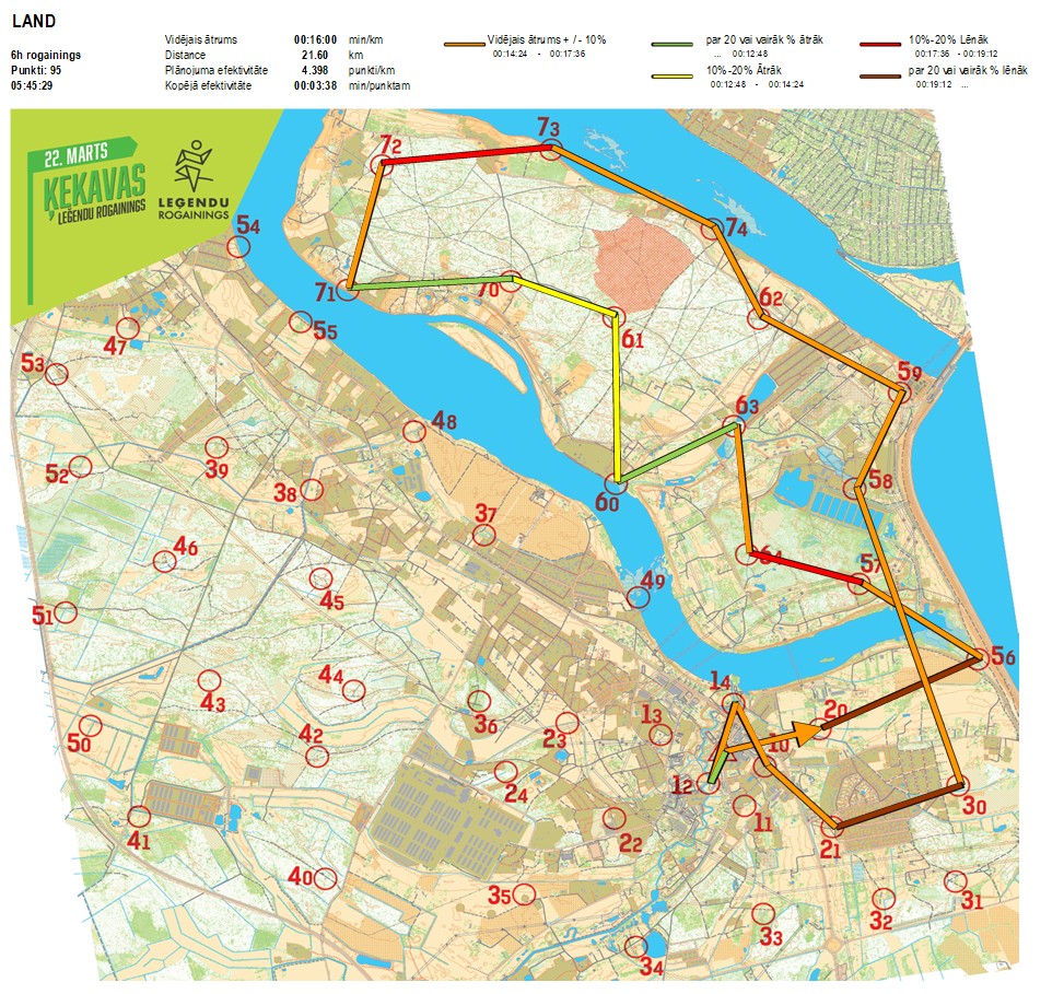 | Secības nr | KP nr | Laiks | Punkti | Kopējie punkti | Posma laiks | Kopējais laiks | Posma distance | Kopējā distance | min/km | min/pts | Vieta etapā |