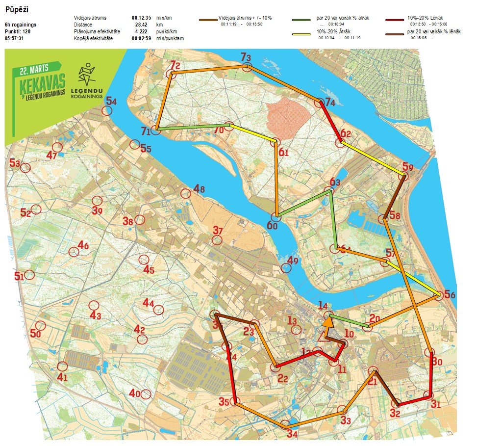 | Secības nr | KP nr | Laiks | Punkti | Kopējie punkti | Posma laiks | Kopējais laiks | Posma distance | Kopējā distance | min/km | min/pts | Vieta etapā |