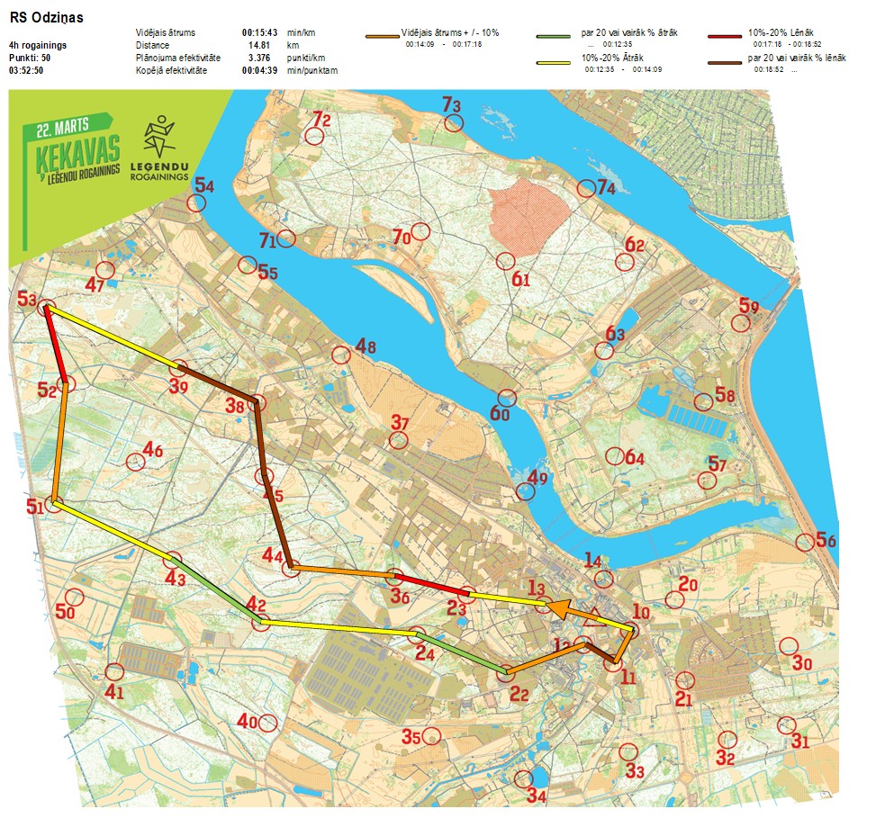 | Secības nr | KP nr | Laiks | Punkti | Kopējie punkti | Posma laiks | Kopējais laiks | Posma distance | Kopējā distance | min/km | min/pts | Vieta etapā |