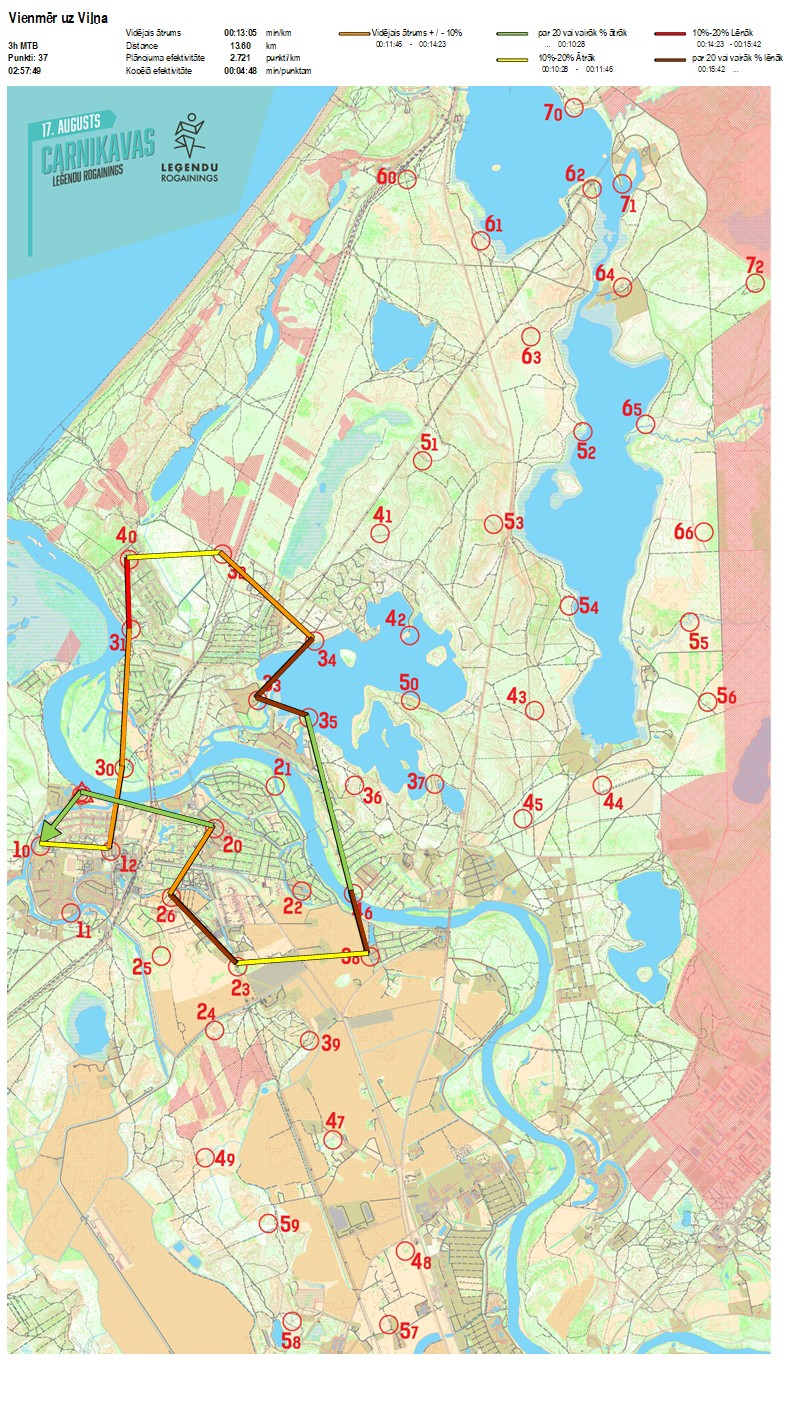 | Secības nr | KP nr | Laiks | Punkti | Kopējie punkti | Posma laiks | Kopējais laiks | Posma distance | Kopējā distance | min/km | min/pts | Vieta etapā |