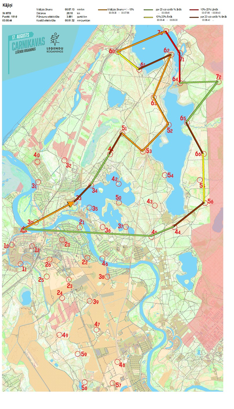 | Secības nr | KP nr | Laiks | Punkti | Kopējie punkti | Posma laiks | Kopējais laiks | Posma distance | Kopējā distance | min/km | min/pts | Vieta etapā |
