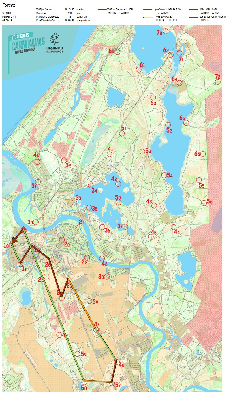 | Secības nr | KP nr | Laiks | Punkti | Kopējie punkti | Posma laiks | Kopējais laiks | Posma distance | Kopējā distance | min/km | min/pts | Vieta etapā |