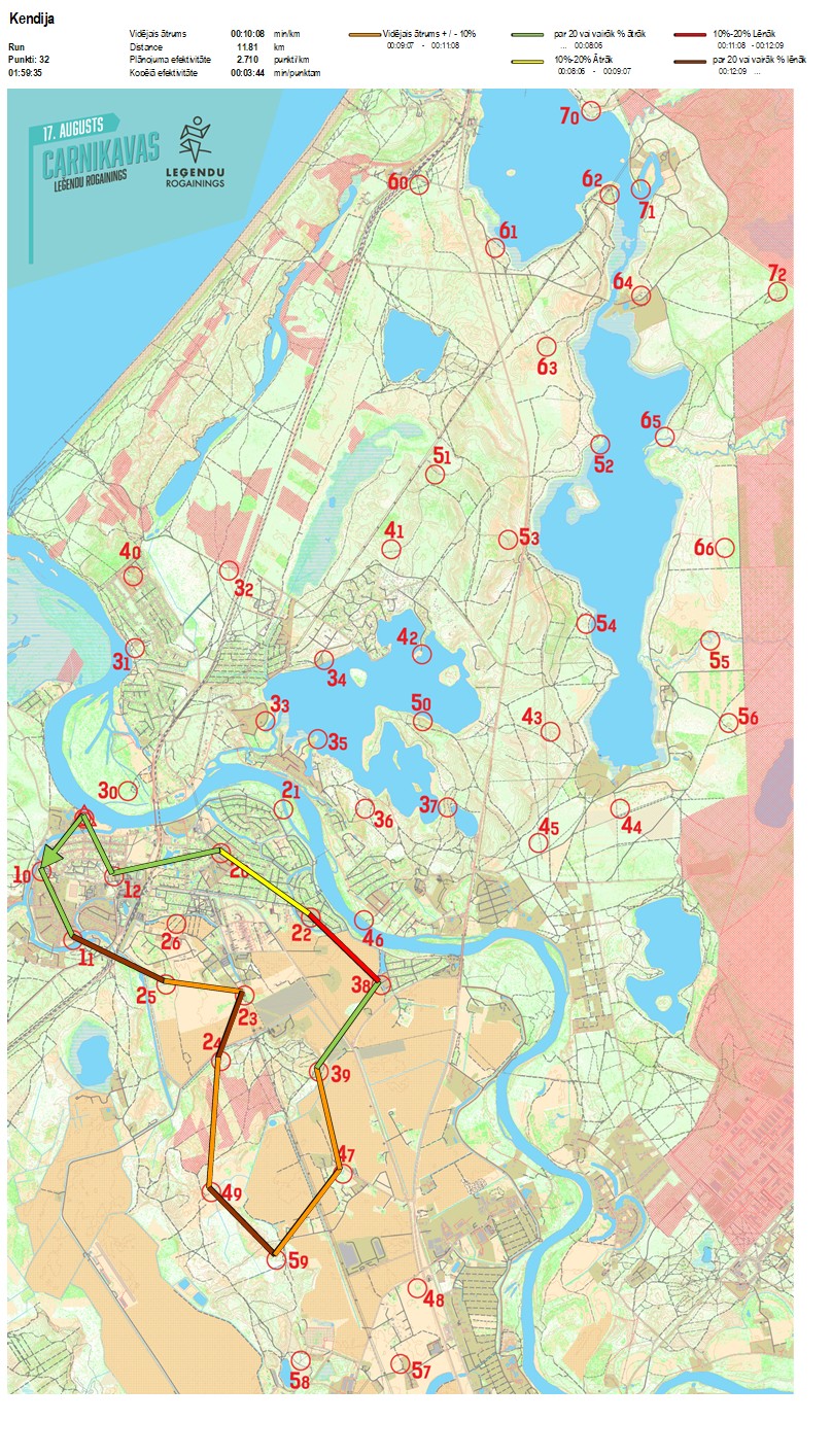 | Secības nr | KP nr | Laiks | Punkti | Kopējie punkti | Posma laiks | Kopējais laiks | Posma distance | Kopējā distance | min/km | min/pts | Vieta etapā |