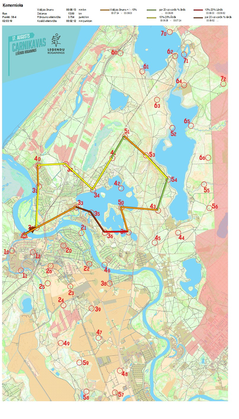 | Secības nr | KP nr | Laiks | Punkti | Kopējie punkti | Posma laiks | Kopējais laiks | Posma distance | Kopējā distance | min/km | min/pts | Vieta etapā |