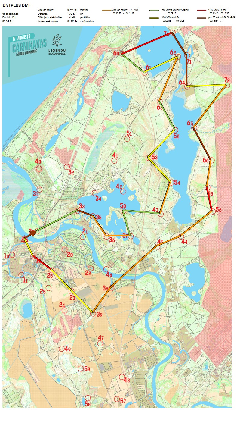 | Secības nr | KP nr | Laiks | Punkti | Kopējie punkti | Posma laiks | Kopējais laiks | Posma distance | Kopējā distance | min/km | min/pts | Vieta etapā |