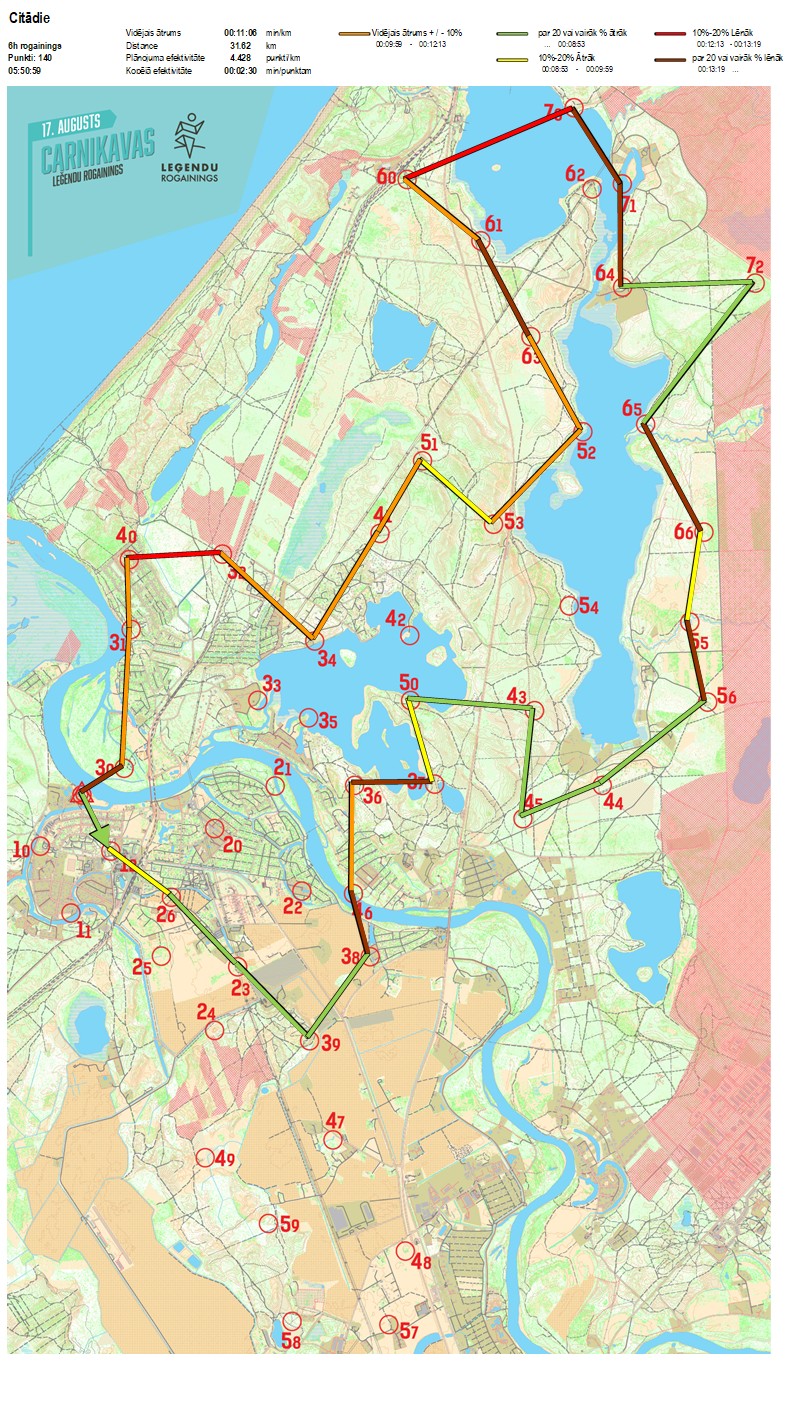 | Secības nr | KP nr | Laiks | Punkti | Kopējie punkti | Posma laiks | Kopējais laiks | Posma distance | Kopējā distance | min/km | min/pts | Vieta etapā |