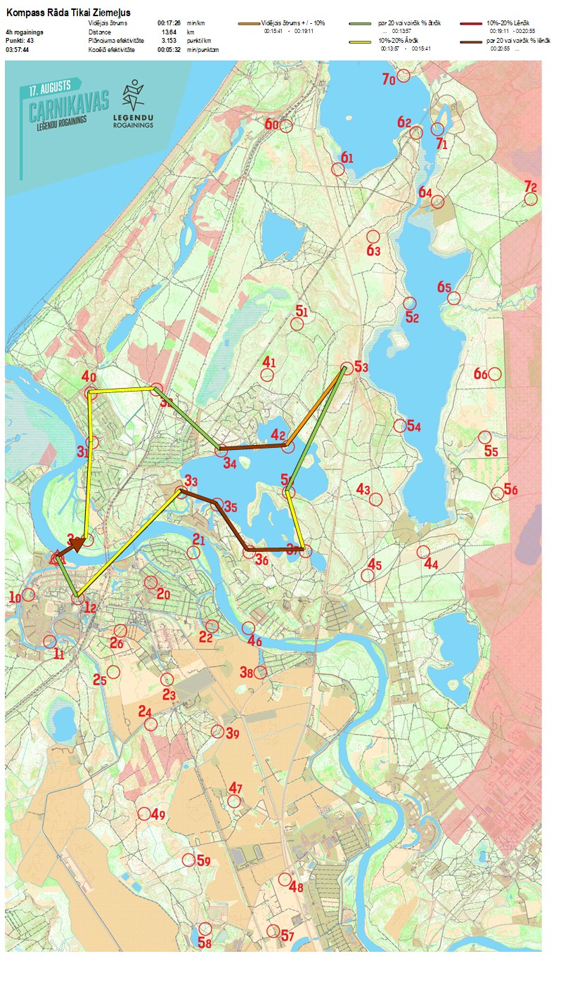 | Secības nr | KP nr | Laiks | Punkti | Kopējie punkti | Posma laiks | Kopējais laiks | Posma distance | Kopējā distance | min/km | min/pts | Vieta etapā |