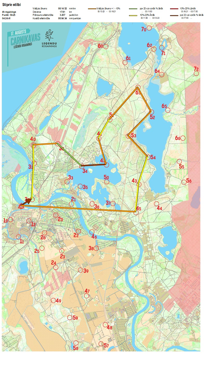 | Secības nr | KP nr | Laiks | Punkti | Kopējie punkti | Posma laiks | Kopējais laiks | Posma distance | Kopējā distance | min/km | min/pts | Vieta etapā |