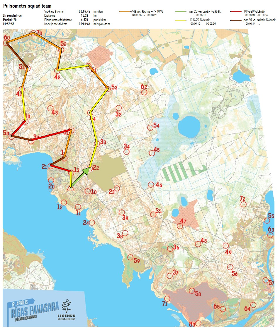 | Secības nr | KP nr | Laiks | Punkti | Kopējie punkti | Posma laiks | Kopējais laiks | Posma distance | Kopējā distance | min/km | min/pts | Vieta etapā |