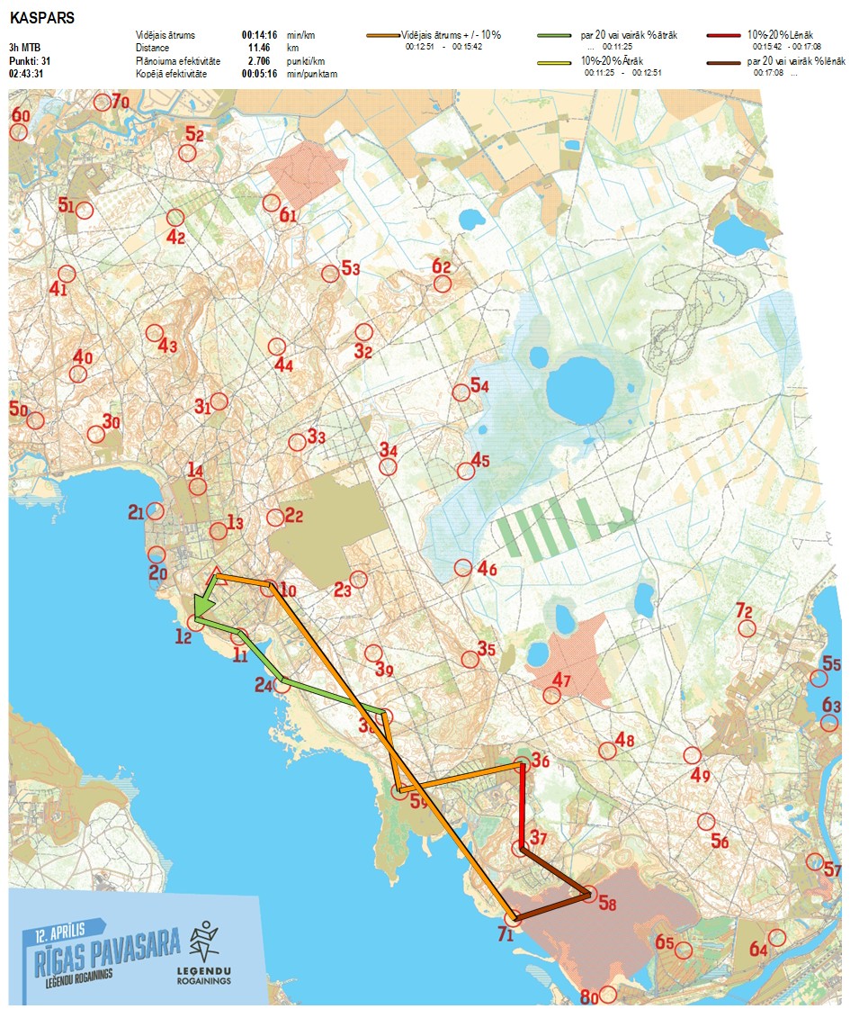 | Secības nr | KP nr | Laiks | Punkti | Kopējie punkti | Posma laiks | Kopējais laiks | Posma distance | Kopējā distance | min/km | min/pts | Vieta etapā |