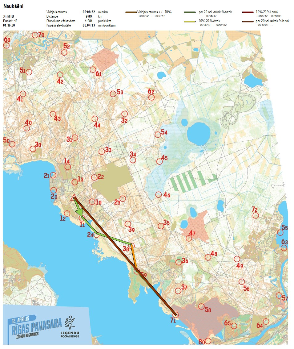 | Secības nr | KP nr | Laiks | Punkti | Kopējie punkti | Posma laiks | Kopējais laiks | Posma distance | Kopējā distance | min/km | min/pts | Vieta etapā |