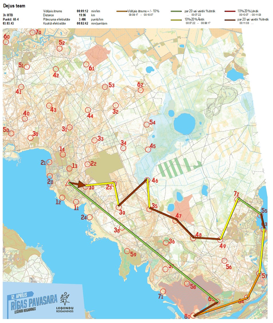 | Secības nr | KP nr | Laiks | Punkti | Kopējie punkti | Posma laiks | Kopējais laiks | Posma distance | Kopējā distance | min/km | min/pts | Vieta etapā |