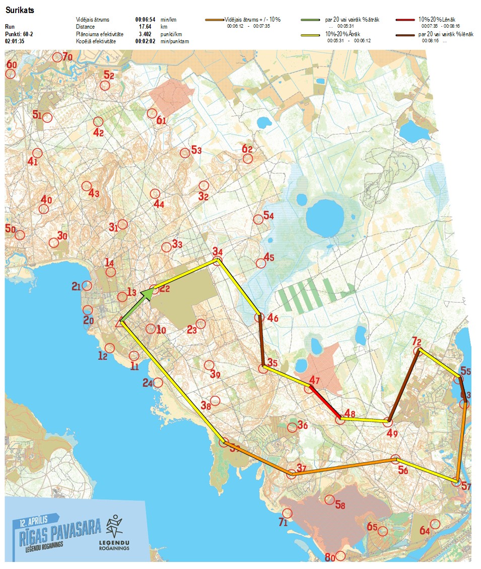 | Secības nr | KP nr | Laiks | Punkti | Kopējie punkti | Posma laiks | Kopējais laiks | Posma distance | Kopējā distance | min/km | min/pts | Vieta etapā |