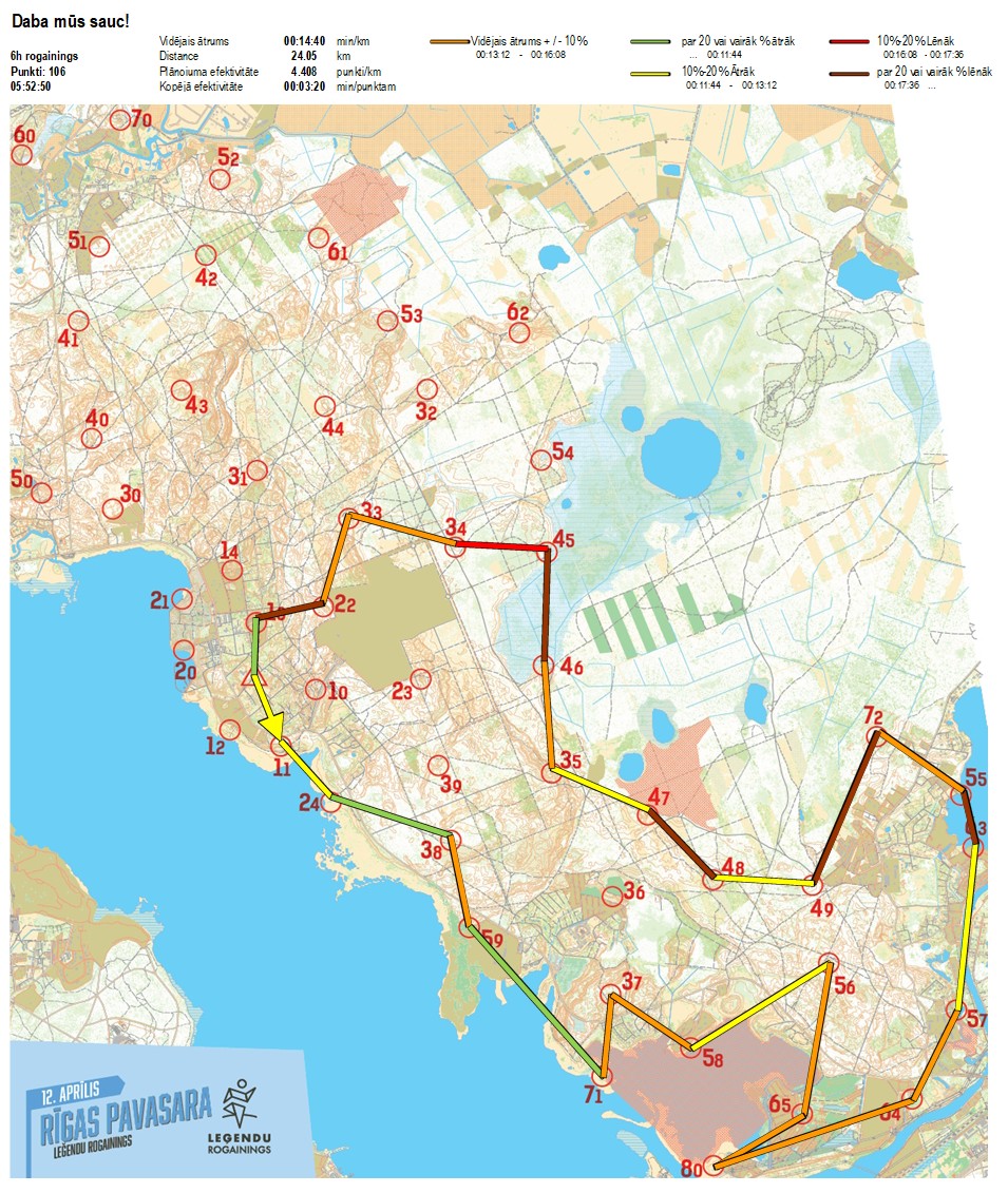 | Secības nr | KP nr | Laiks | Punkti | Kopējie punkti | Posma laiks | Kopējais laiks | Posma distance | Kopējā distance | min/km | min/pts | Vieta etapā |