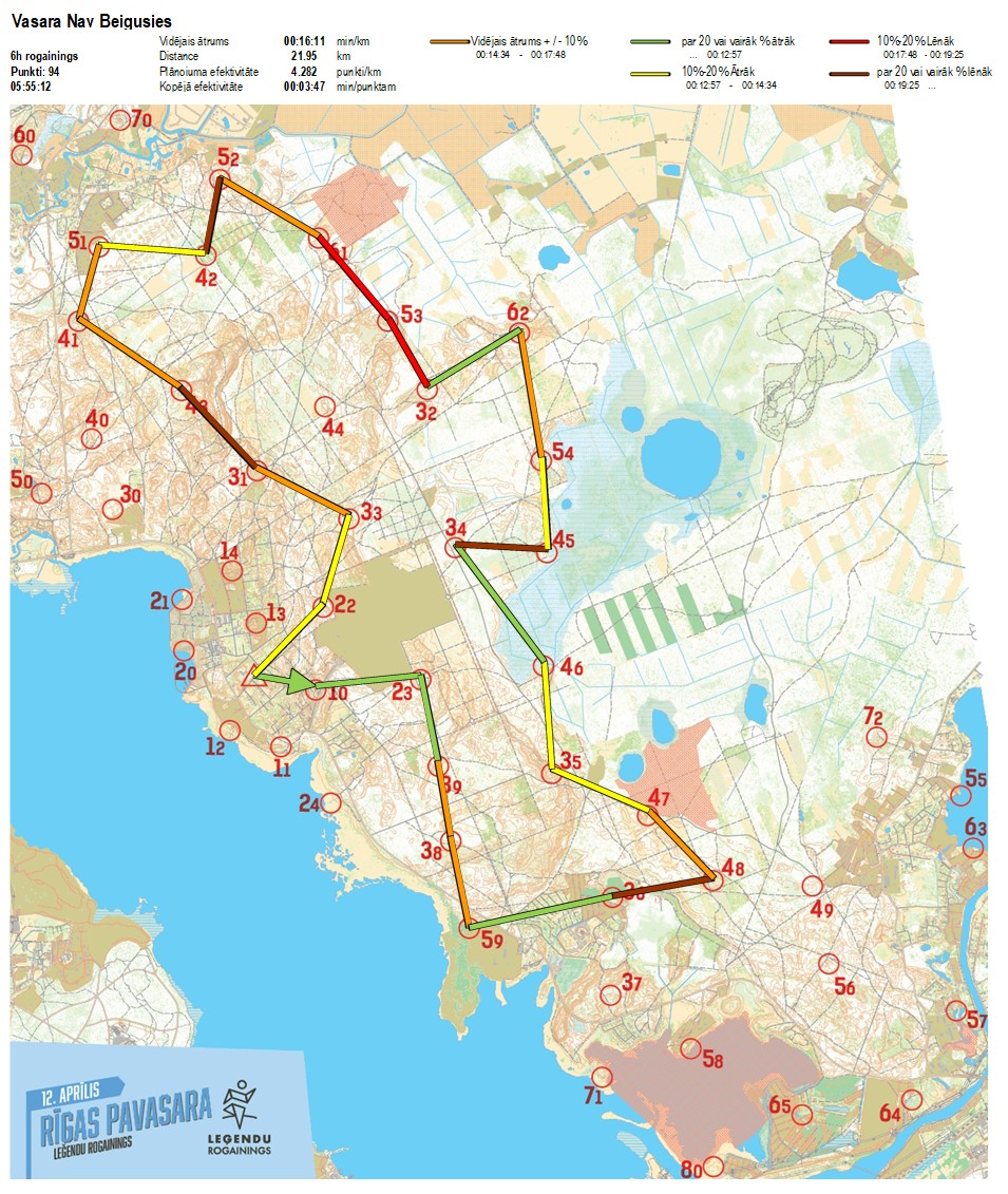 | Secības nr | KP nr | Laiks | Punkti | Kopējie punkti | Posma laiks | Kopējais laiks | Posma distance | Kopējā distance | min/km | min/pts | Vieta etapā |