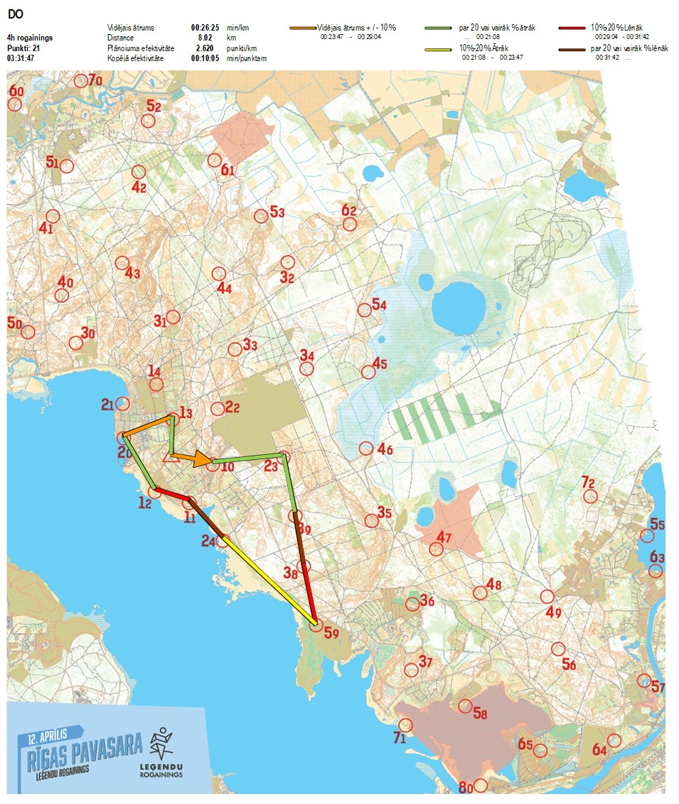 | Secības nr | KP nr | Laiks | Punkti | Kopējie punkti | Posma laiks | Kopējais laiks | Posma distance | Kopējā distance | min/km | min/pts | Vieta etapā |