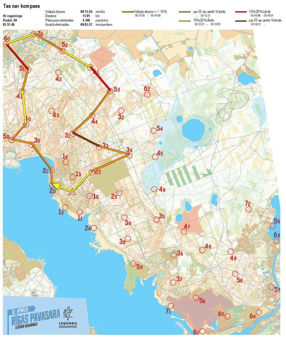 | Secības nr | KP nr | Laiks | Punkti | Kopējie punkti | Posma laiks | Kopējais laiks | Posma distance | Kopējā distance | min/km | min/pts | Vieta etapā |