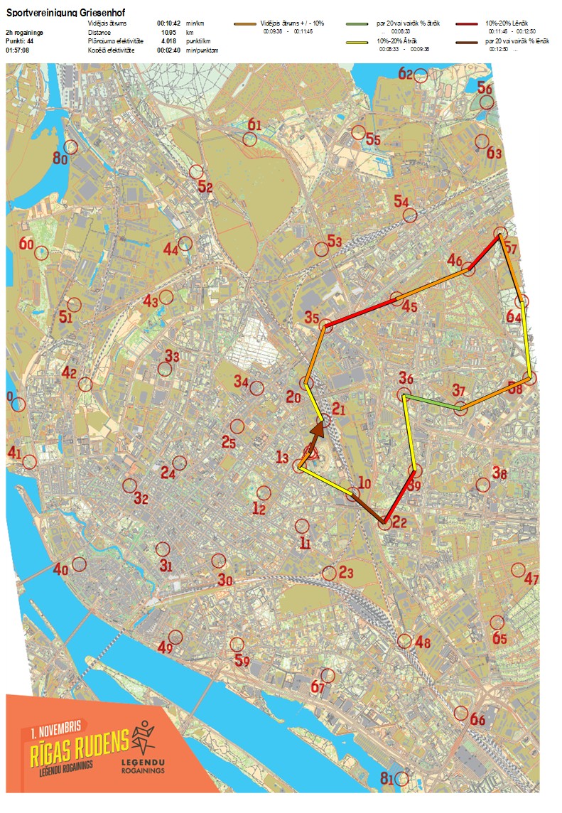 | Secības nr | KP nr | Laiks | Punkti | Kopējie punkti | Posma laiks | Kopējais laiks | Posma distance | Kopējā distance | min/km | min/pts | Vieta etapā |