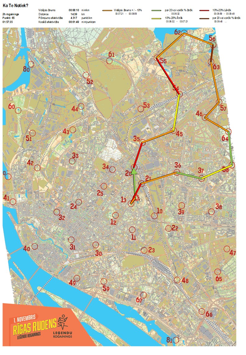 | Secības nr | KP nr | Laiks | Punkti | Kopējie punkti | Posma laiks | Kopējais laiks | Posma distance | Kopējā distance | min/km | min/pts | Vieta etapā |