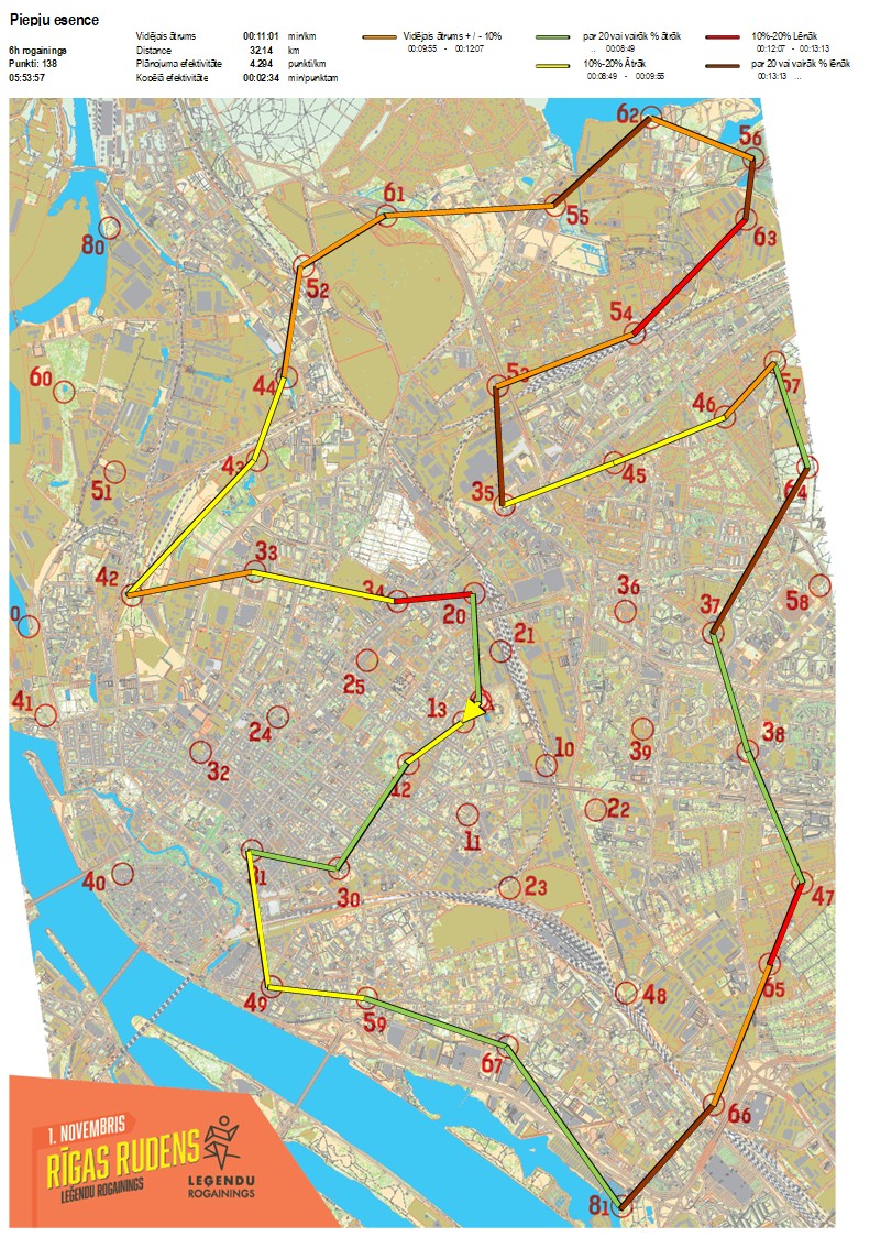 | Secības nr | KP nr | Laiks | Punkti | Kopējie punkti | Posma laiks | Kopējais laiks | Posma distance | Kopējā distance | min/km | min/pts | Vieta etapā |