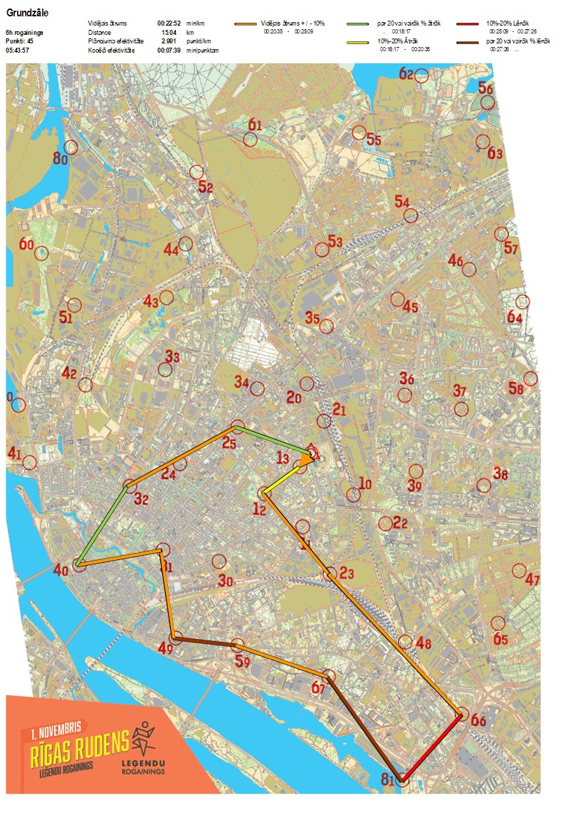 | Secības nr | KP nr | Laiks | Punkti | Kopējie punkti | Posma laiks | Kopējais laiks | Posma distance | Kopējā distance | min/km | min/pts | Vieta etapā |