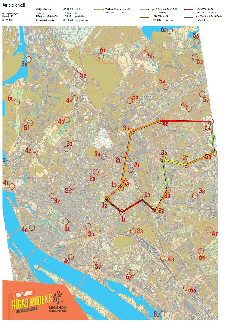 | Secības nr | KP nr | Laiks | Punkti | Kopējie punkti | Posma laiks | Kopējais laiks | Posma distance | Kopējā distance | min/km | min/pts | Vieta etapā |