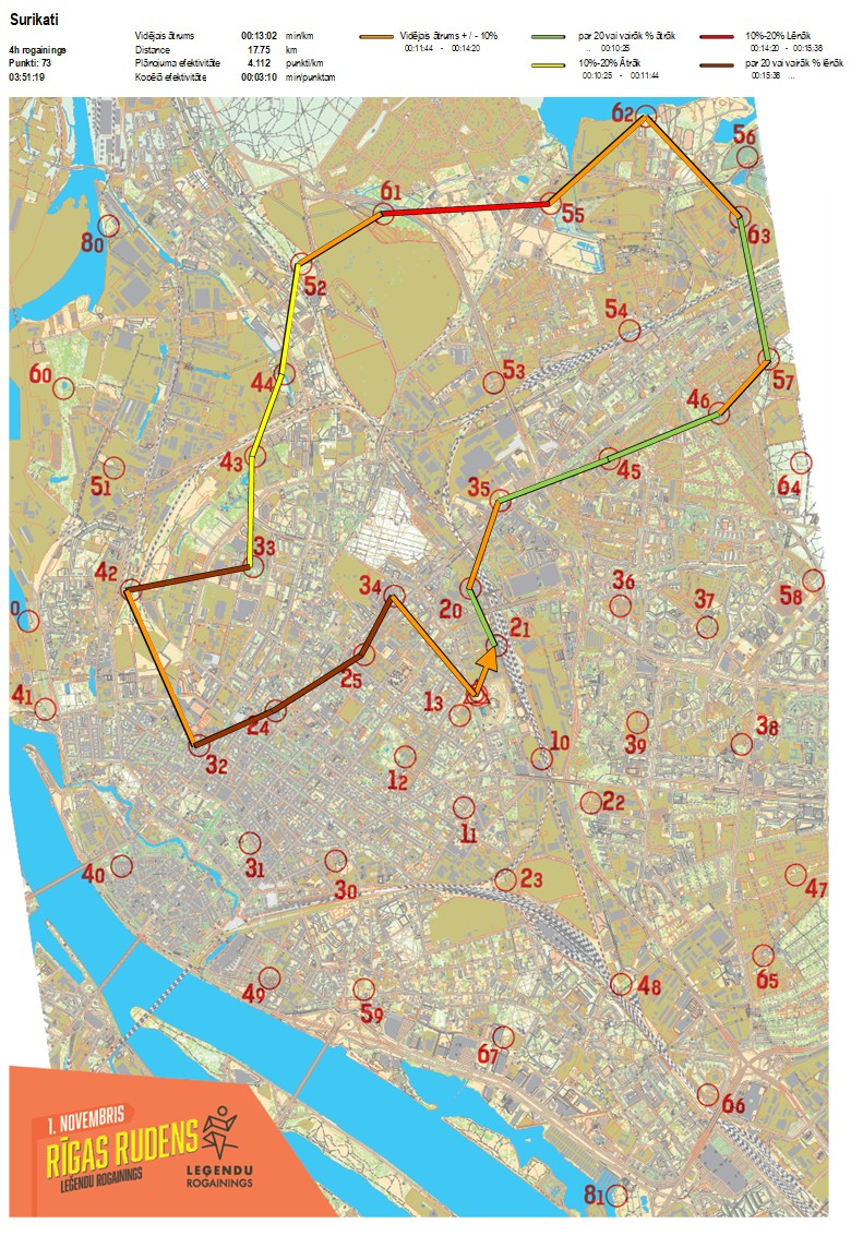 | Secības nr | KP nr | Laiks | Punkti | Kopējie punkti | Posma laiks | Kopējais laiks | Posma distance | Kopējā distance | min/km | min/pts | Vieta etapā |