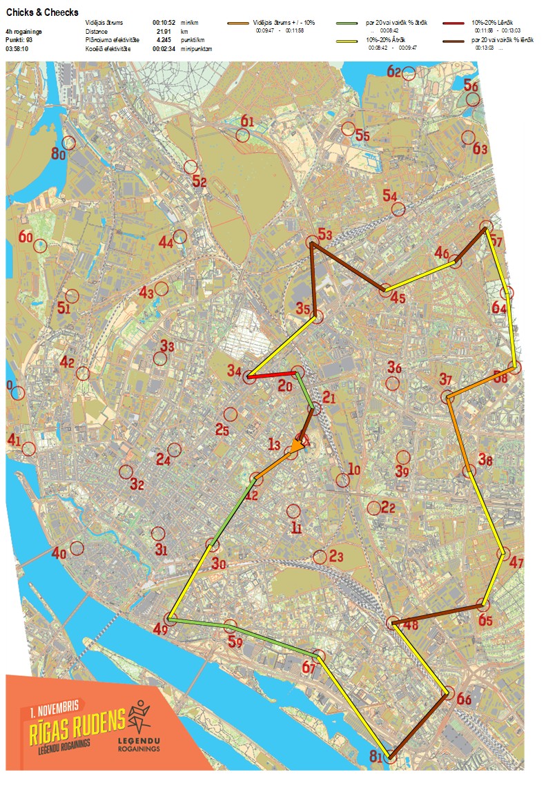 | Secības nr | KP nr | Laiks | Punkti | Kopējie punkti | Posma laiks | Kopējais laiks | Posma distance | Kopējā distance | min/km | min/pts | Vieta etapā |
