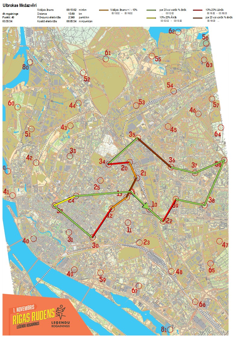 | Secības nr | KP nr | Laiks | Punkti | Kopējie punkti | Posma laiks | Kopējais laiks | Posma distance | Kopējā distance | min/km | min/pts | Vieta etapā |