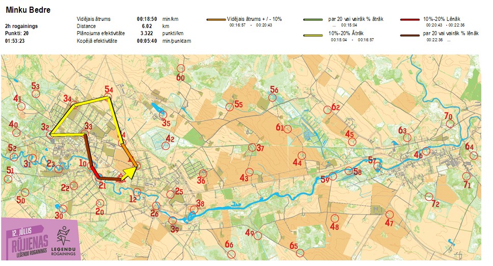 | Secības nr | KP nr | Laiks | Punkti | Kopējie punkti | Posma laiks | Kopējais laiks | Posma distance | Kopējā distance | min/km | min/pts | Vieta etapā |