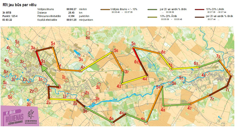 | Secības nr | KP nr | Laiks | Punkti | Kopējie punkti | Posma laiks | Kopējais laiks | Posma distance | Kopējā distance | min/km | min/pts | Vieta etapā |