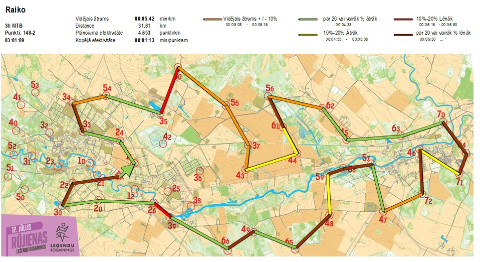 | Secības nr | KP nr | Laiks | Punkti | Kopējie punkti | Posma laiks | Kopējais laiks | Posma distance | Kopējā distance | min/km | min/pts | Vieta etapā |