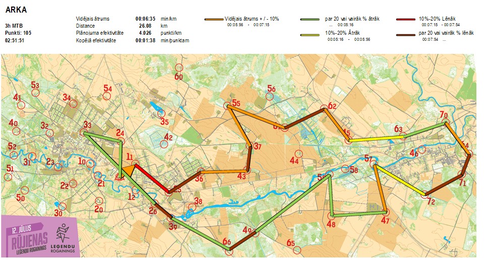 | Secības nr | KP nr | Laiks | Punkti | Kopējie punkti | Posma laiks | Kopējais laiks | Posma distance | Kopējā distance | min/km | min/pts | Vieta etapā |