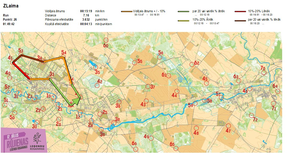| Secības nr | KP nr | Laiks | Punkti | Kopējie punkti | Posma laiks | Kopējais laiks | Posma distance | Kopējā distance | min/km | min/pts | Vieta etapā |