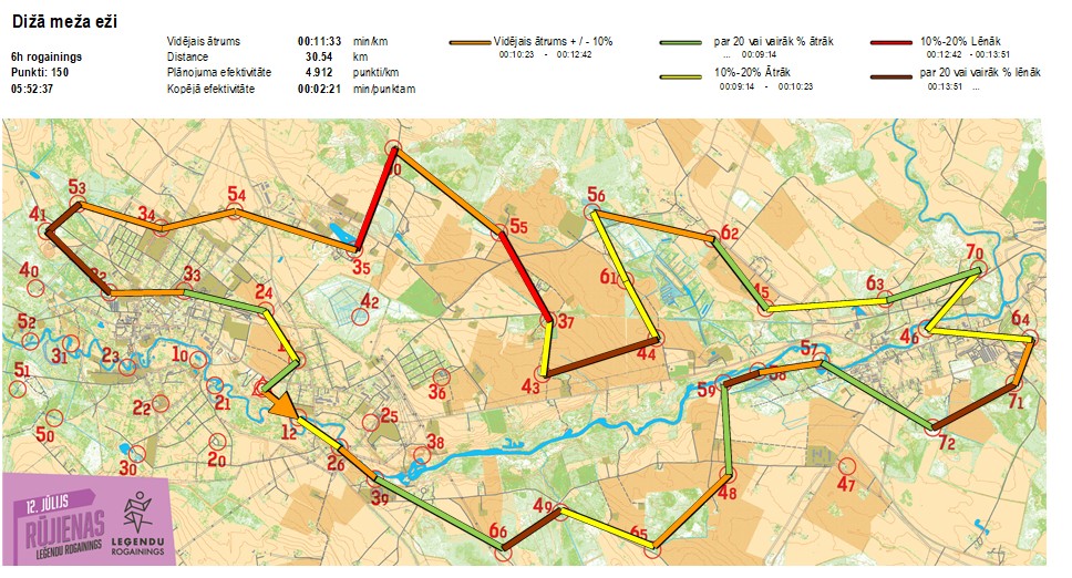 | Secības nr | KP nr | Laiks | Punkti | Kopējie punkti | Posma laiks | Kopējais laiks | Posma distance | Kopējā distance | min/km | min/pts | Vieta etapā |