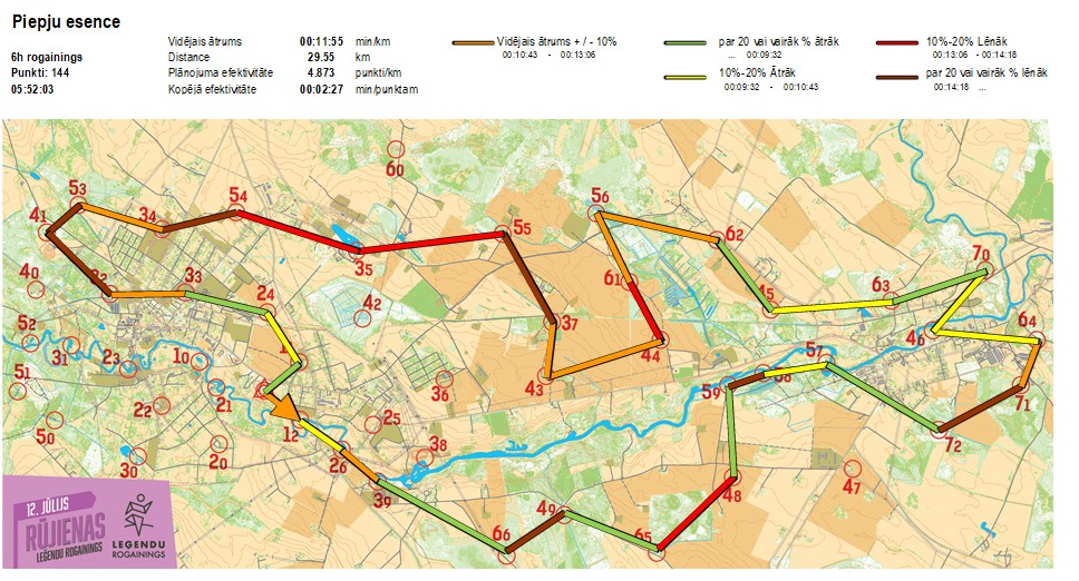 | Secības nr | KP nr | Laiks | Punkti | Kopējie punkti | Posma laiks | Kopējais laiks | Posma distance | Kopējā distance | min/km | min/pts | Vieta etapā |