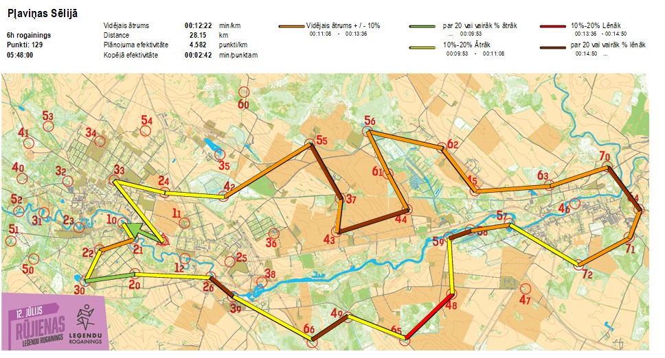 | Secības nr | KP nr | Laiks | Punkti | Kopējie punkti | Posma laiks | Kopējais laiks | Posma distance | Kopējā distance | min/km | min/pts | Vieta etapā |