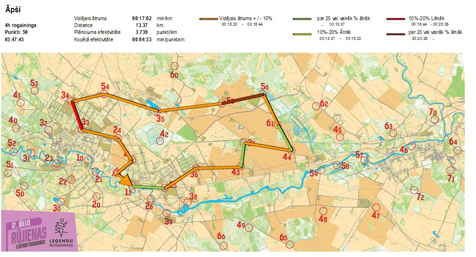 | Secības nr | KP nr | Laiks | Punkti | Kopējie punkti | Posma laiks | Kopējais laiks | Posma distance | Kopējā distance | min/km | min/pts | Vieta etapā |