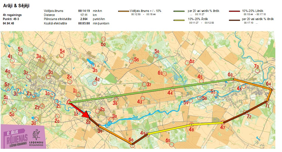 | Secības nr | KP nr | Laiks | Punkti | Kopējie punkti | Posma laiks | Kopējais laiks | Posma distance | Kopējā distance | min/km | min/pts | Vieta etapā |