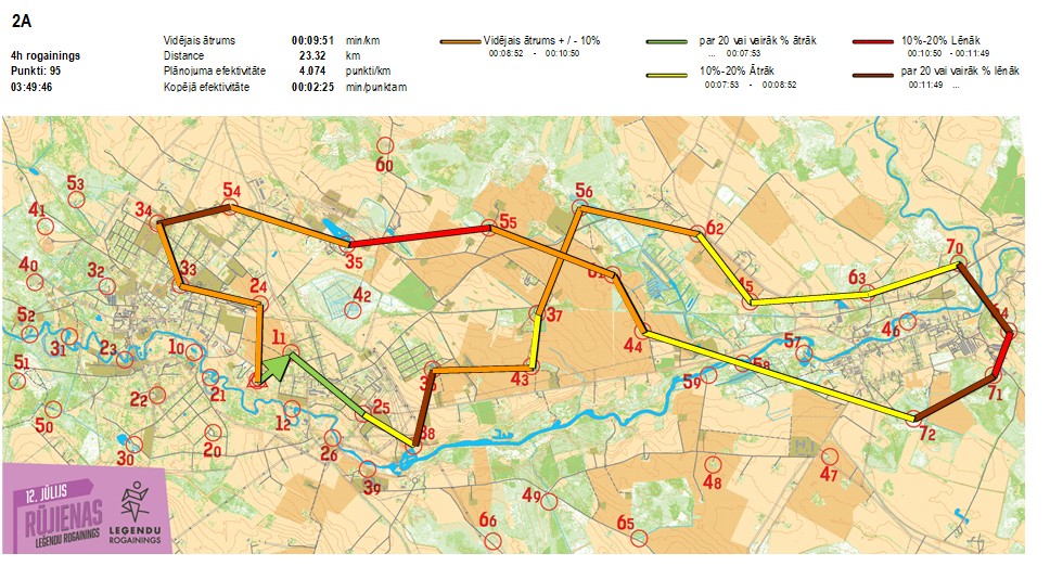 | Secības nr | KP nr | Laiks | Punkti | Kopējie punkti | Posma laiks | Kopējais laiks | Posma distance | Kopējā distance | min/km | min/pts | Vieta etapā |