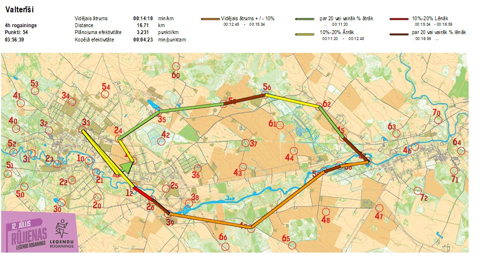 | Secības nr | KP nr | Laiks | Punkti | Kopējie punkti | Posma laiks | Kopējais laiks | Posma distance | Kopējā distance | min/km | min/pts | Vieta etapā |